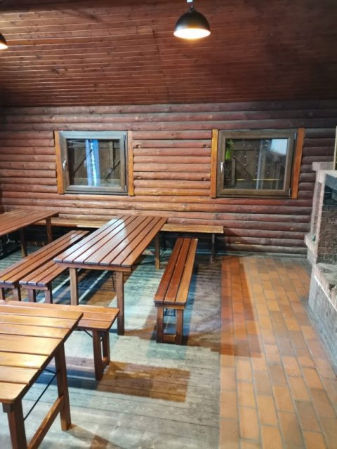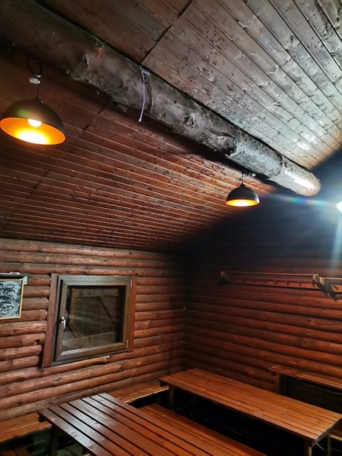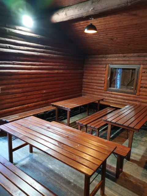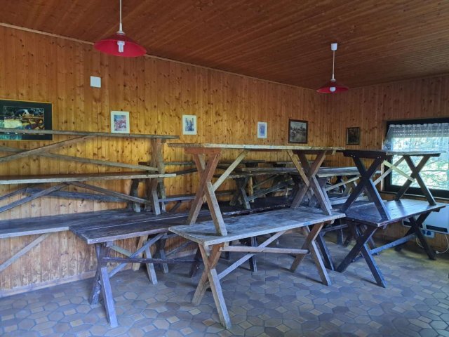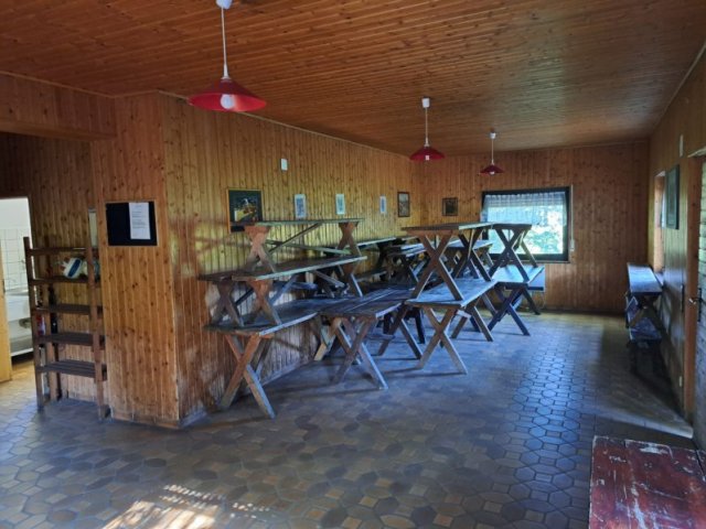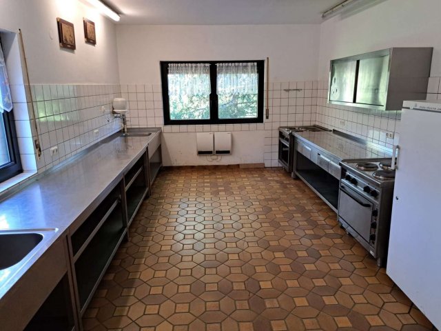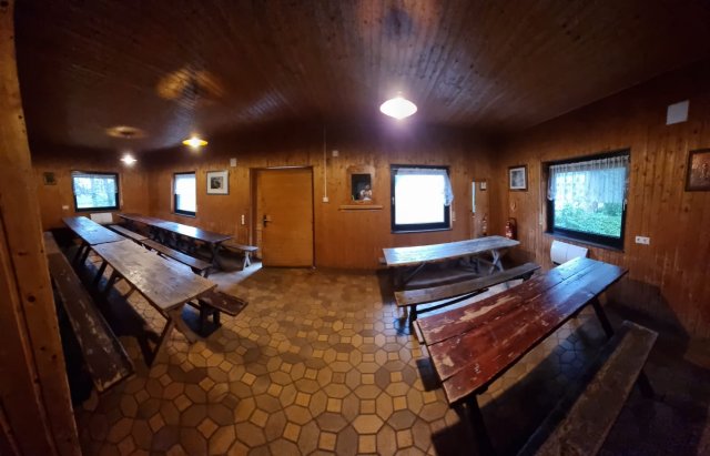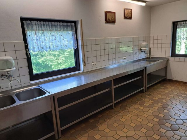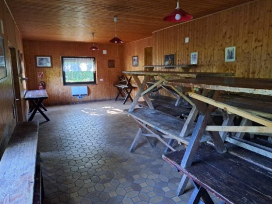 Im Erdgeschoss des Gebäudes befindet sich ein Versammlungsraum mit ca. 40 rustikalen Sitzplätzen. Auf der gleichen Ebene befindet sich eine Küche, in der warme Mahlzeiten zubereitet