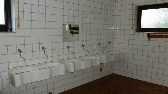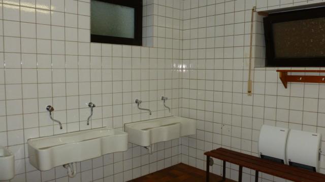 Im Souterrain des Gebäudes sind die sanitären Einrichtungen untergebracht. Wachbecken, Duschzellen und Toiletten sind nach Geschlecht getrennt und jeweils von außen zugänglich.