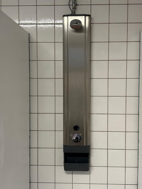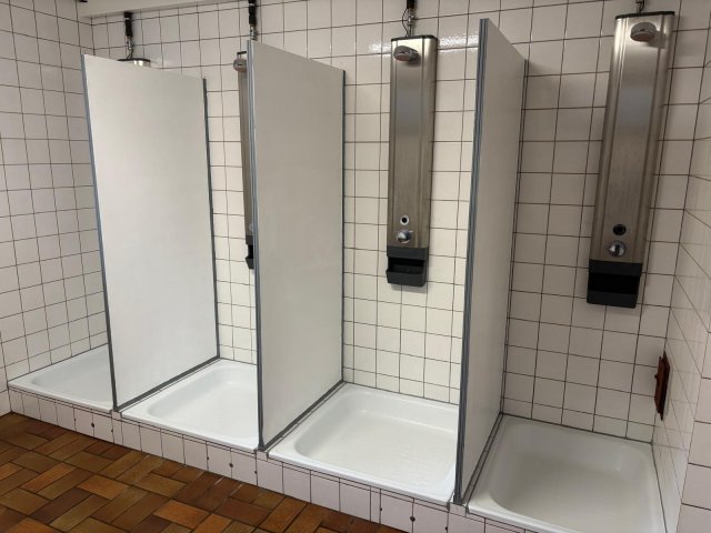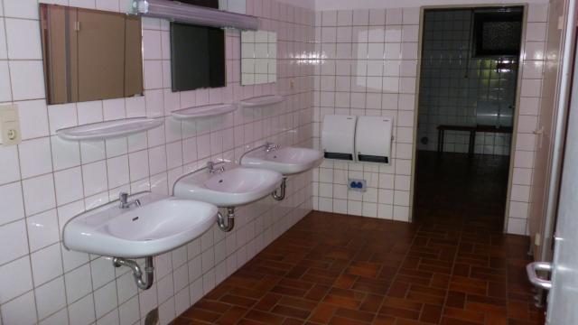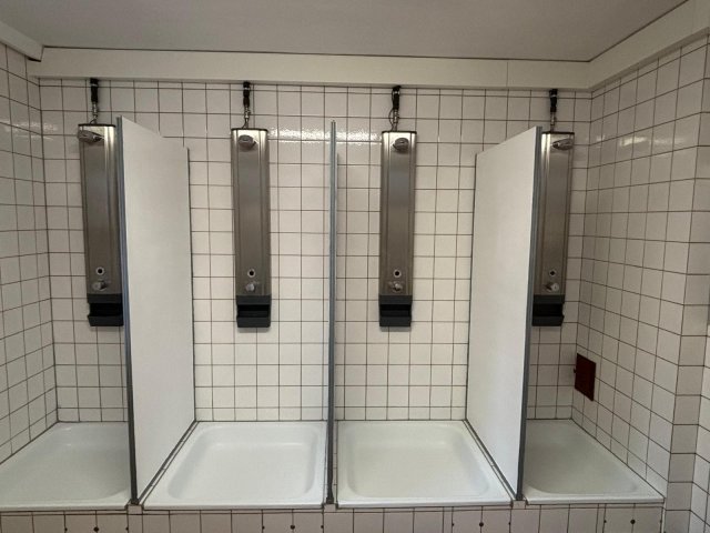 Im Souterrain des Gebäudes sind die sanitären Einrichtungen untergebracht. Wachbecken, Duschzellen und Toiletten sind nach Geschlecht getrennt und jeweils von außen zugänglich.